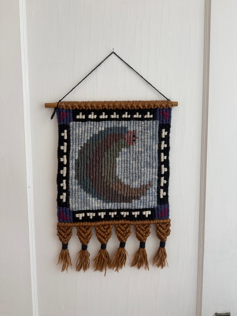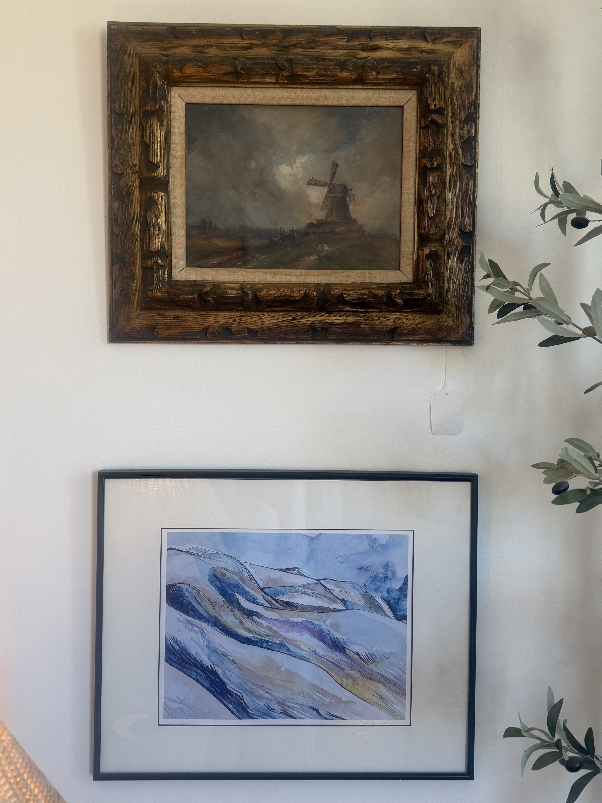 I purchased the top and bottom left painting at an antique store in Maine, the middle left on facebook marketplace, the top right at Eldred’s auction house and the bottom right in Colorado. I honestly can’t remember how much these cost exactly. The top and bottom left and the bottom right were all around $20. The middle left and top right were maybe $200, which is the most expensive so far on the tour! The top left is such a cool piece; it is silk-based textile art, so it’s created using dyed or painted silk and it looks like a scene of an East Asian village. The left middle painting is oil on canvas and signed M. Jackson. Looking through many M. Jacksons’ works, I’m guessing it’s most likely Martin Jackson, a Philadelphia based painter in the 1900s. The bottom left watercolor is surprisingly one of my only winter scenes, no signature. On the top right is a pastel on board and the auction cites “DUTCH SCHOOL” as the artist or maker; it is an early 20th century landscape with a windmill. The bottom right is one of my first paintings ever. It is a watercolor titled “Sand Dunes” by Kelsey Shields and it still has a special spot in my heart.