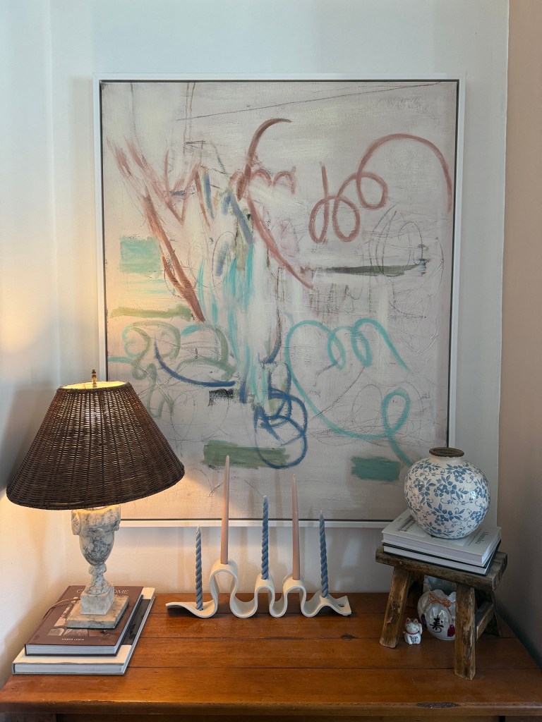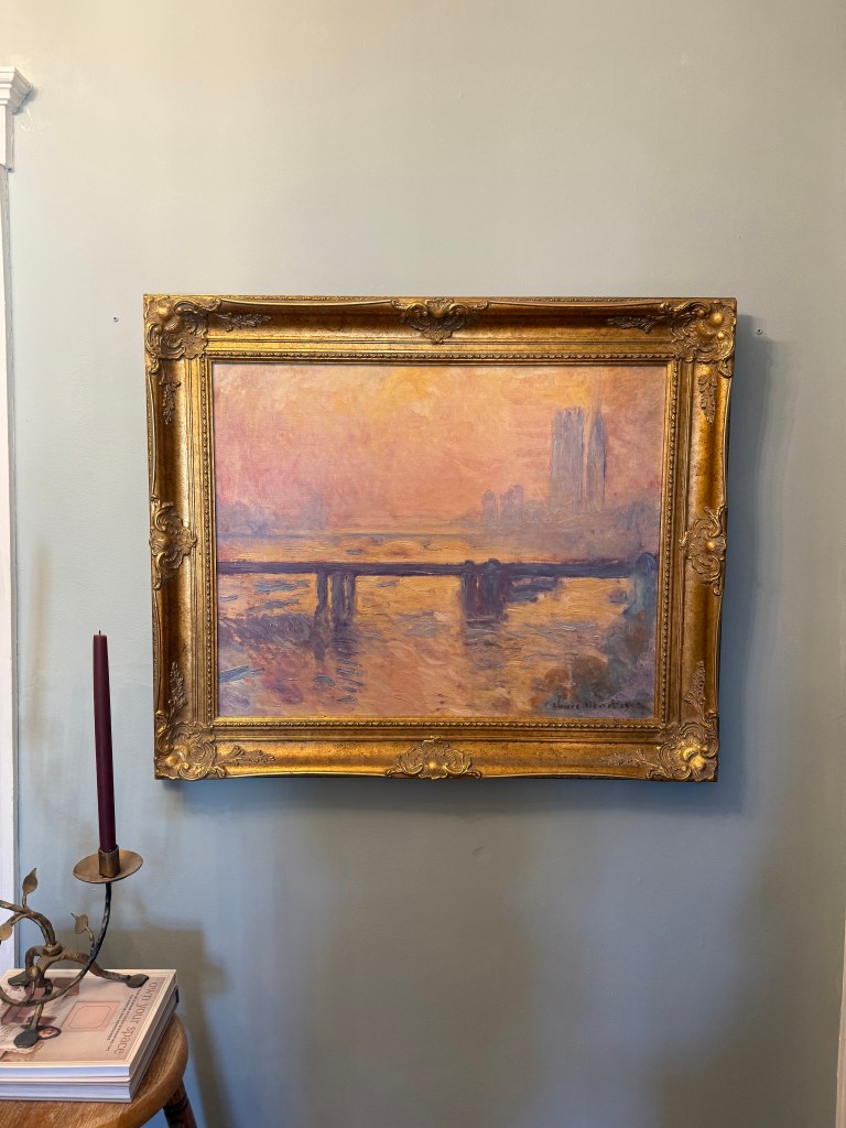 These two paints are my earliest pieces of artwork together with Sand Dunes. The left painting here is an abstract piece titled Tally by Patrick St Germain for CB2. I purchased it in 2021 for $300. It was really before I started getting into vintage art and paintings and I loved it. If I recall, it was designed to reflect the writing of Cy Twomnly in the style of Basquiat. I honestly still love it and feels so different than everything else I own. On the right is a reproduction of one of Monet’s paintings, Charing Cross Bridge, that I got from Craigslist in early 2021 (before facebook marketplace was really a thing) for $100. Monet is one of my favorite artists of all time and this is as close as I’ll ever get to having one of his paintings in my home, so I’ll take it! This is a limited edition piece from the Brushstrokes Collection / the Museum Shop and this reproduction is actually super well done and it comes with a Certificate of Authenticity! This, for obvious reasons, is one of my favorite pieces.