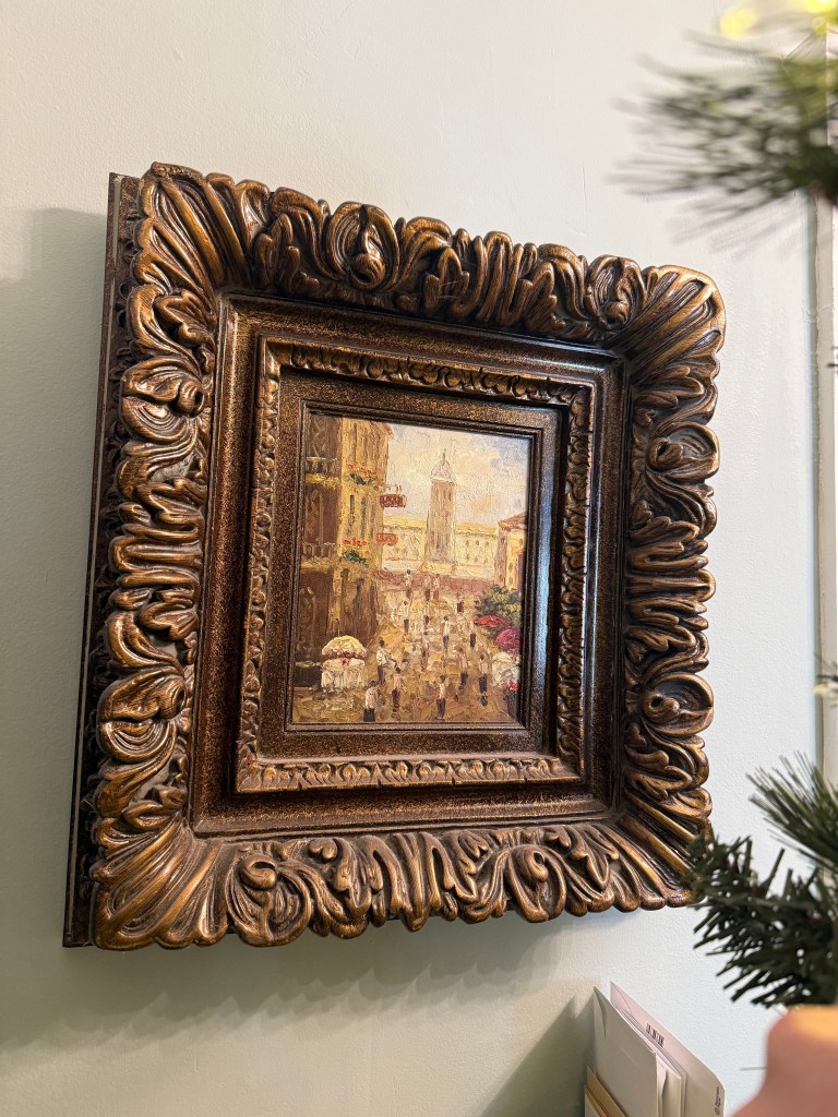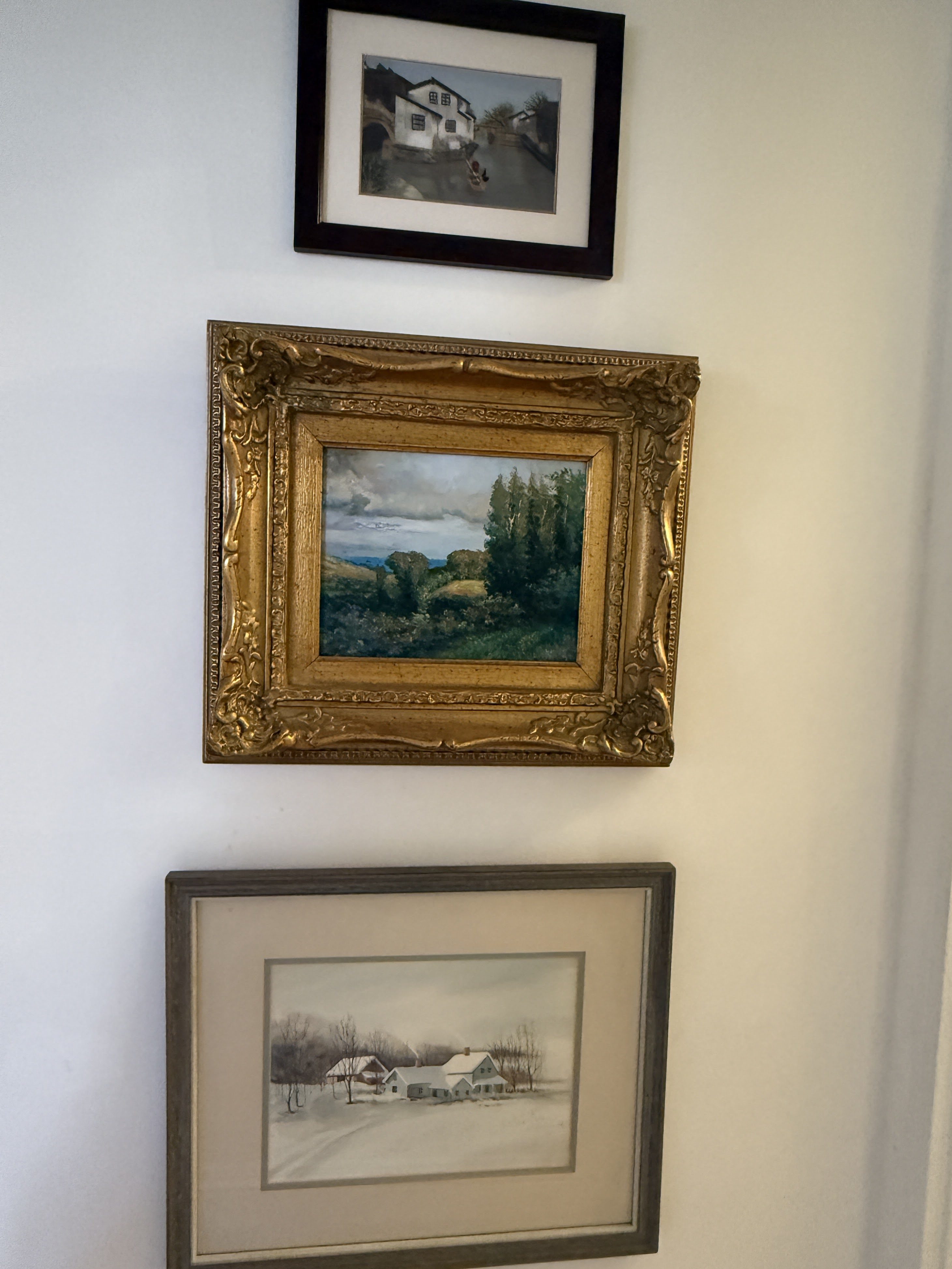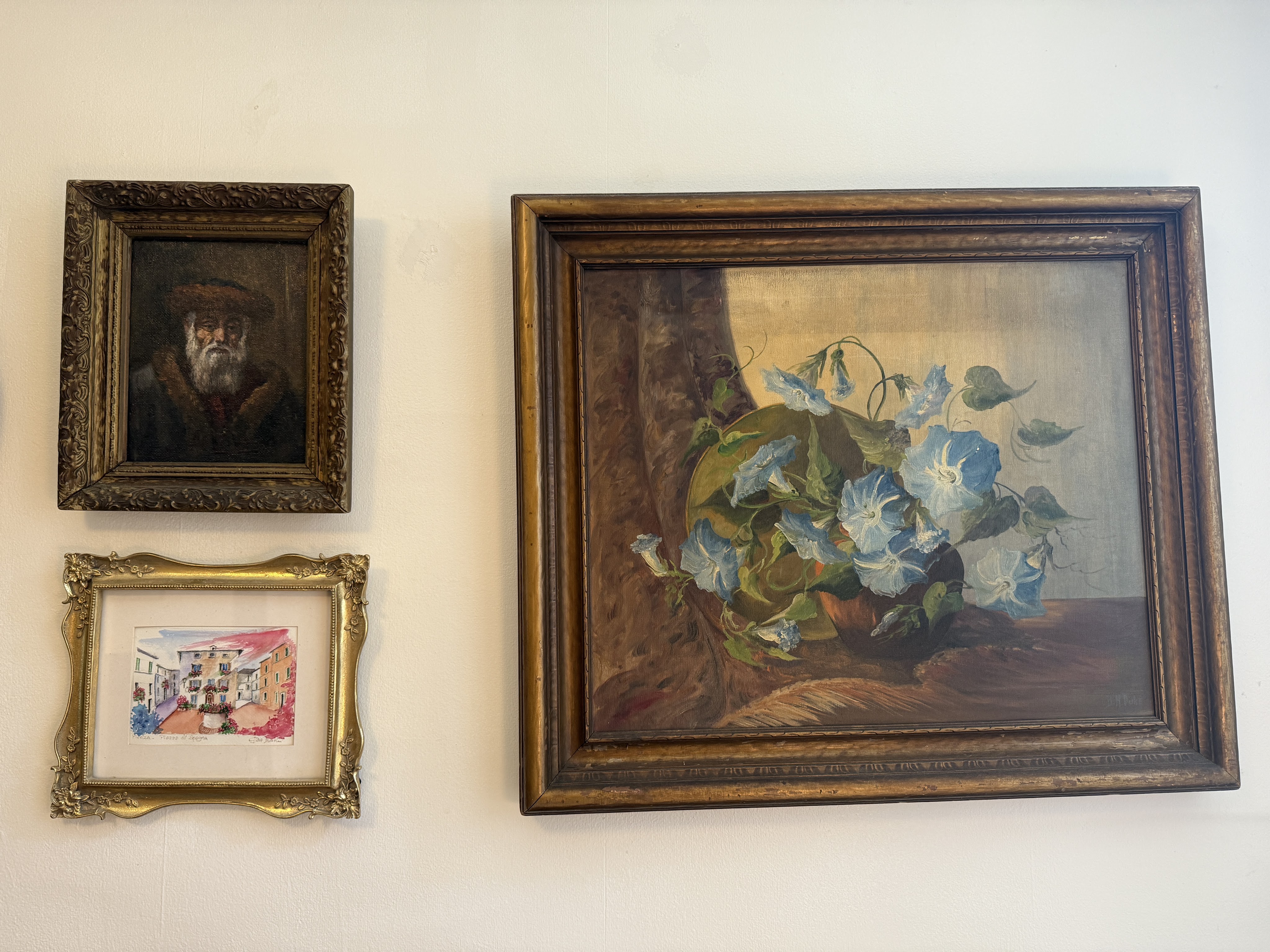 The oil painting on the right I bought on facebook marketplace for $100 back in 2022. It is signed “B.H Duke” most likely referring to Bertha Hatton Duke, an American artist from Indiana and active during the mid 20th century. The top left painting was from Brimfield, no signature and not much else known, and the bottom left was a gift from my sister from her travels in Italy.