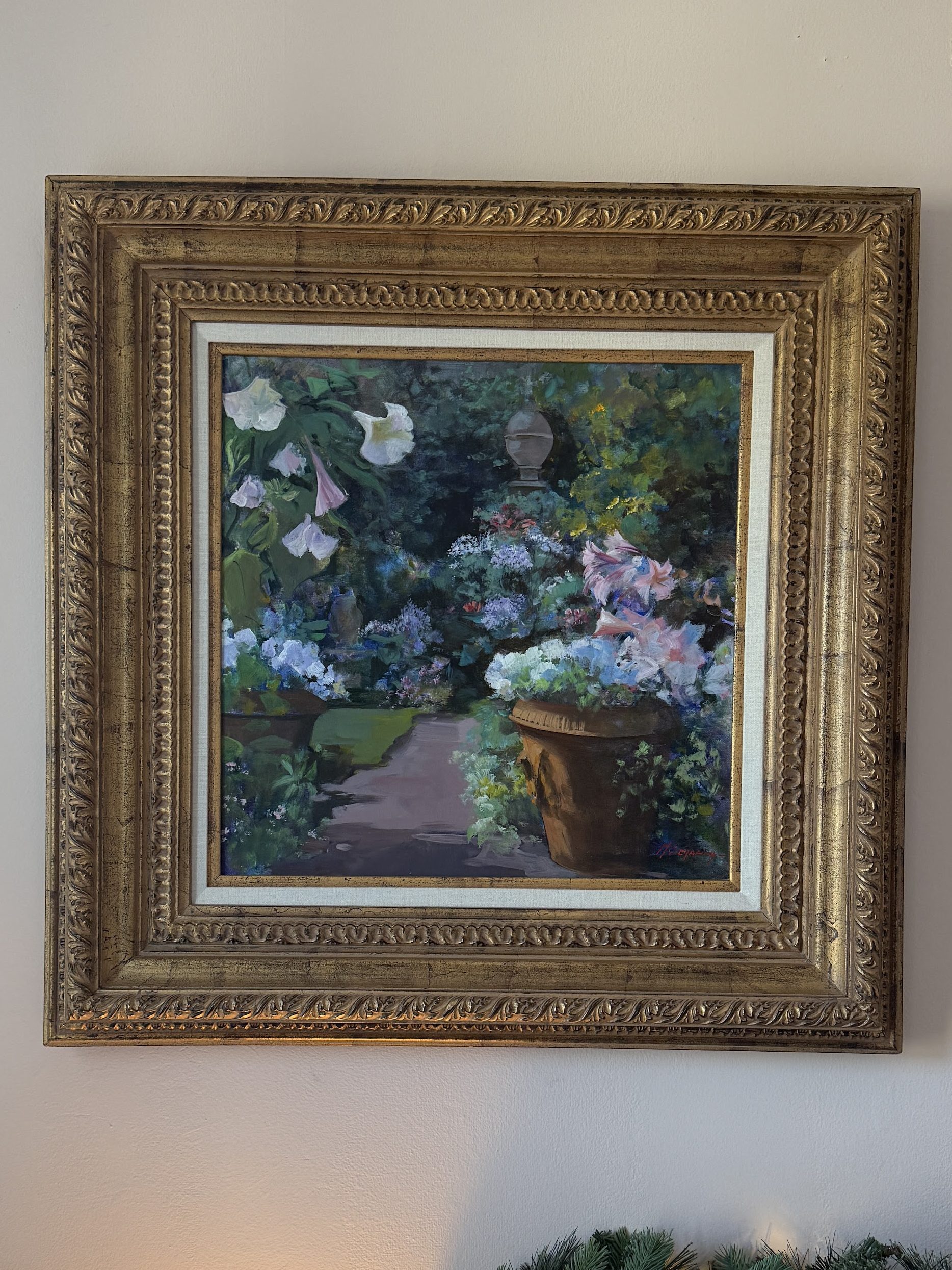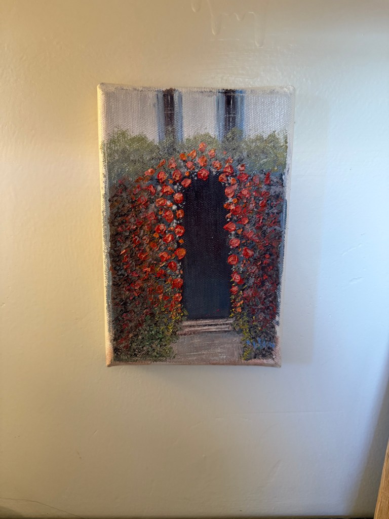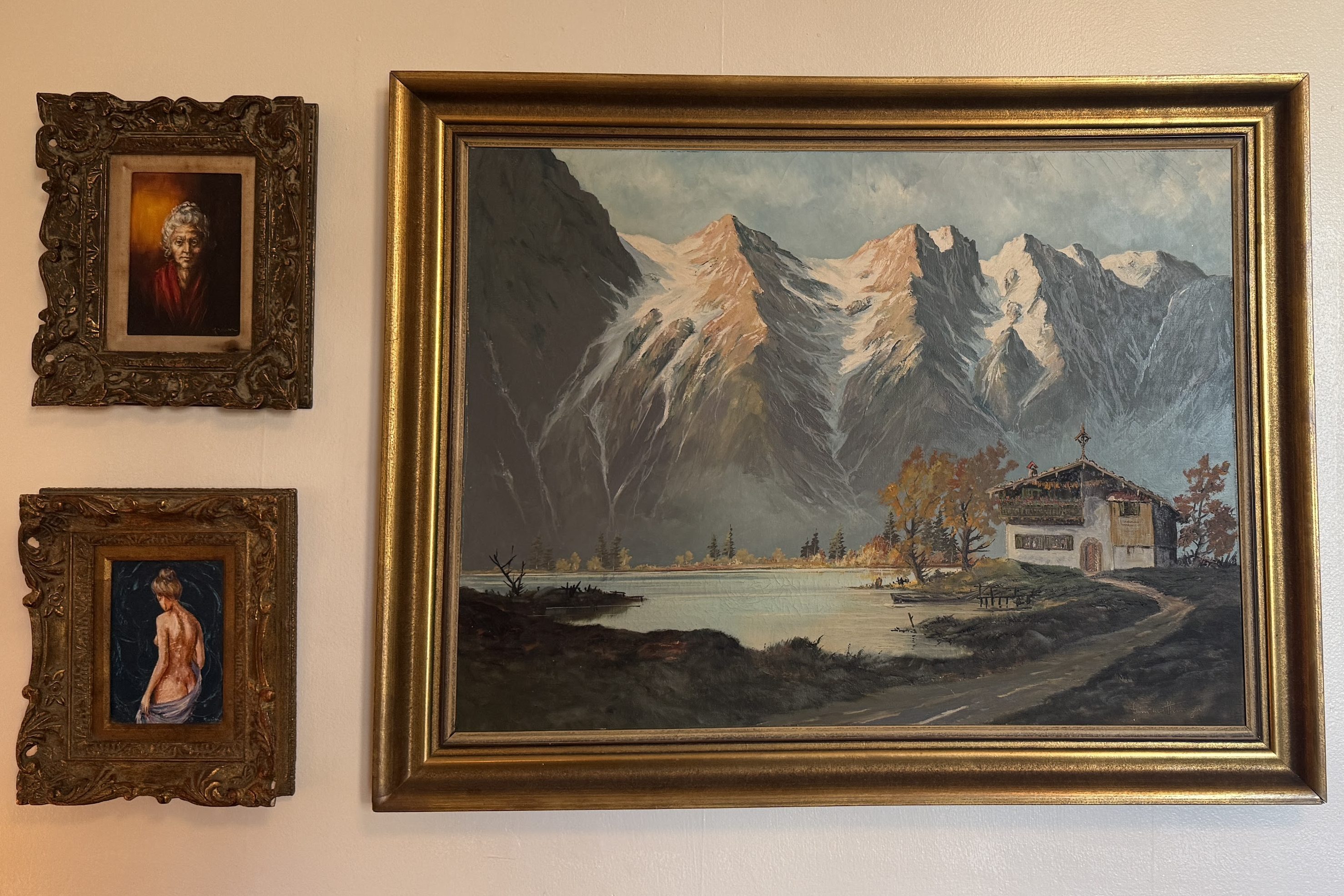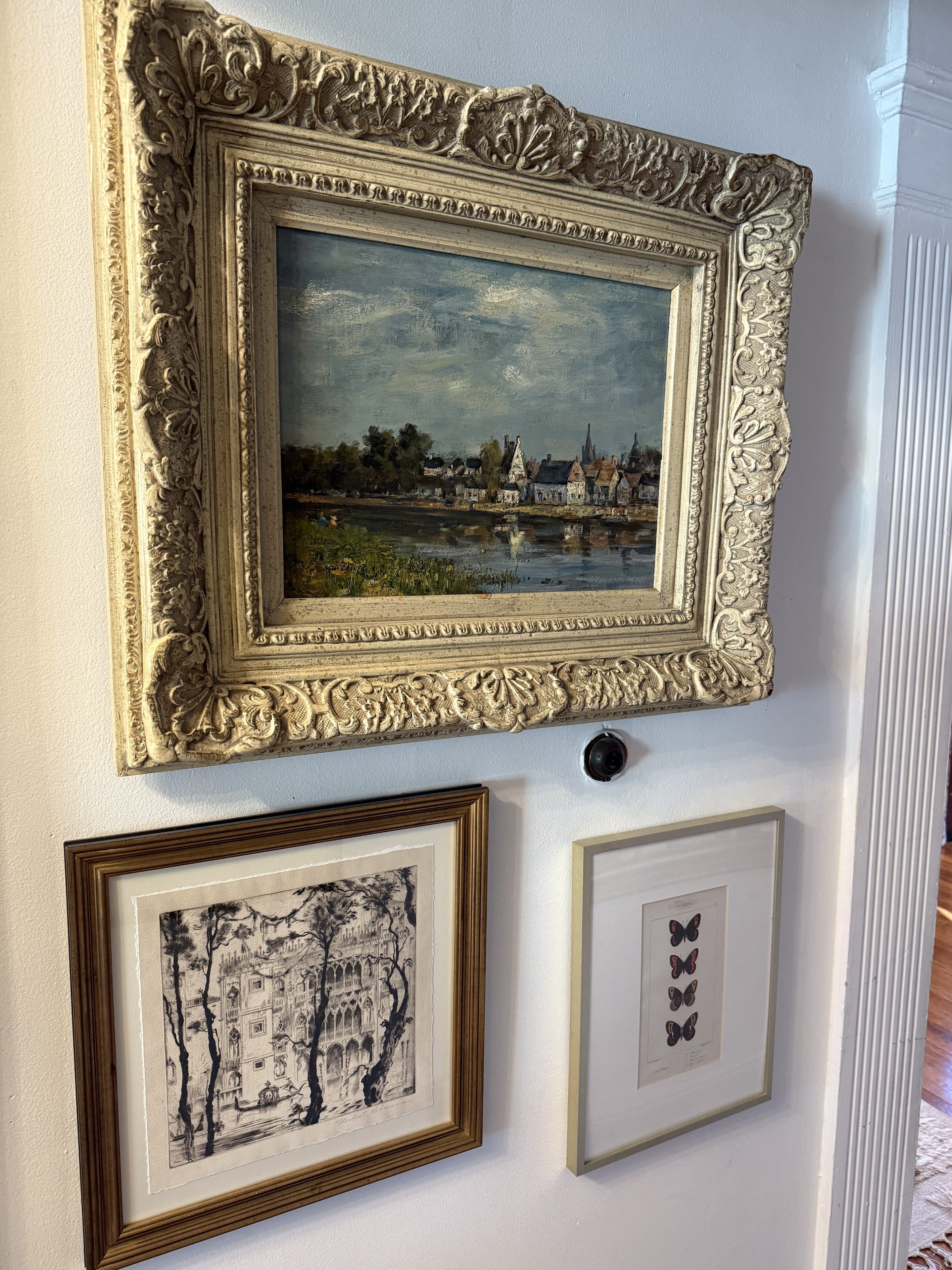 The oil painting on the right I bought on facebook marketplace for $100 back in 2022. It is signed “B.H Duke” most likely referring to Bertha Hatton Duke, an American artist from Indiana and active during the mid 20th century. The top left painting was from Brimfield, no signature and not much else known, and the bottom left was a gift from my sister from her travels in Italy.