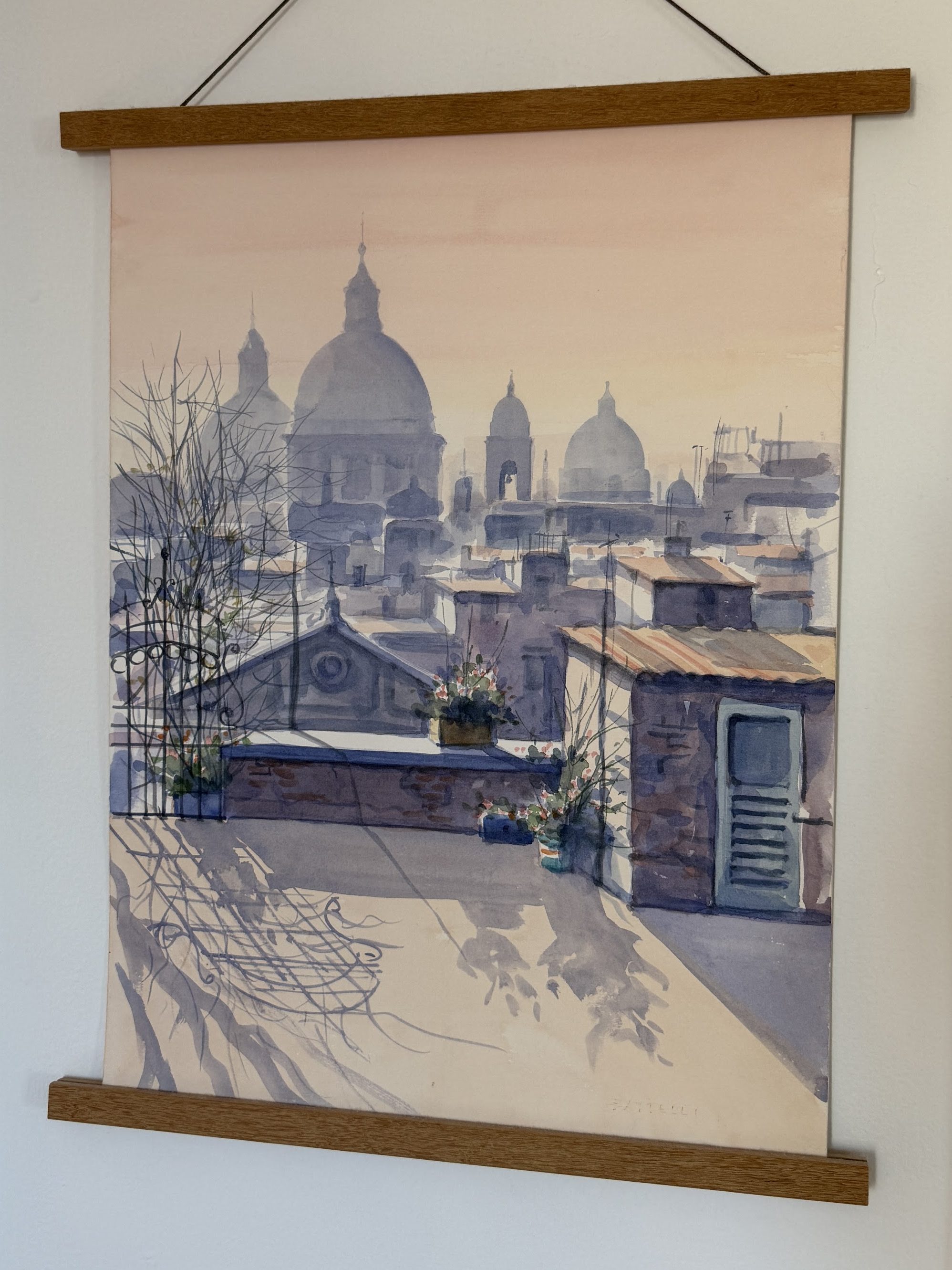 Both of these paintings currently live in my bedroom. At the time of this post, this left painting is my most recent acquisition (late 2025). It is an oil painting from facebook marketplace purchased for $400 (my most expensive painting purchased to date). It is signed M. Serafina, referring to Maria Serafina, an Italian artist born in 1955. It is quite large and I absolutely love the florals here (which is quite rare). The right painting is a watercolor by Fausto Battelli, an Italian lithographer and painter, that I purchased for $100. I found it at an antique store in Michigan on my way down from the great lakes back to Chicago. I honestly look at it every morning when I wake up and everything feels so peaceful and calm from this rooftop in Rome.