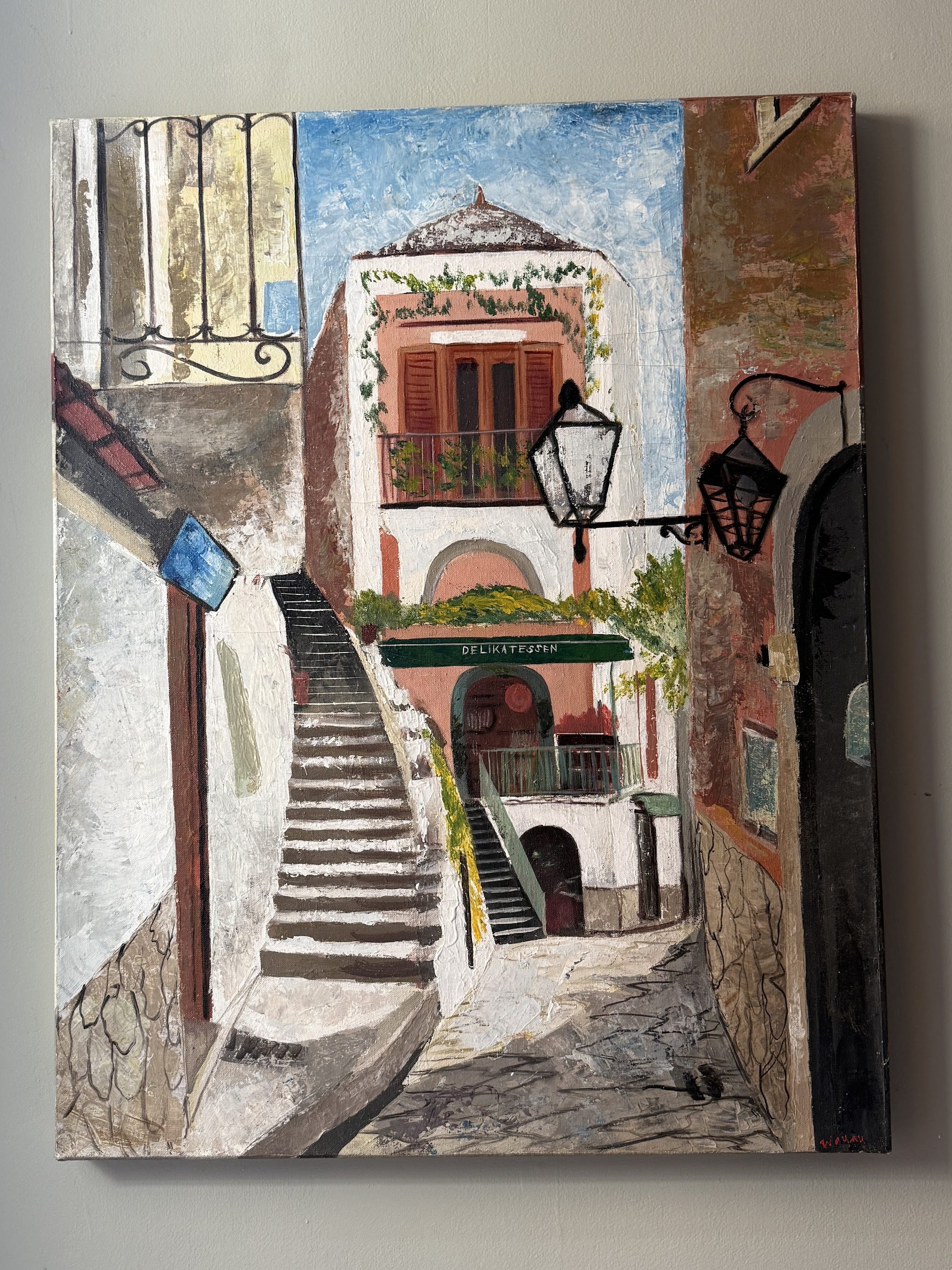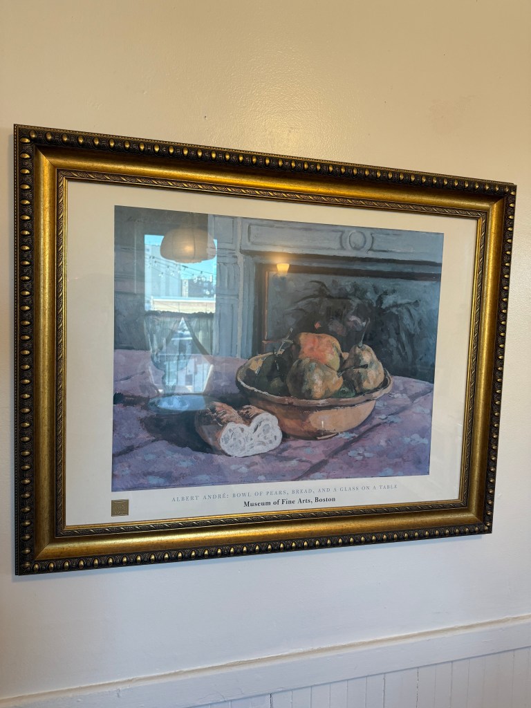 Both of these paintings I got from facebook marketplace in 2022 in the suburbs of MA, both are oil on canvas, and both were $20. The left painting was made in Italy and shows a street and grocery store “Delicatessen” in Positano, Italy. I actually went on google maps and found the exact place. It feels very quaint and unserious and romantic. It’s a naive perspective, the colors are quite whimsical, and I just love looking at it. The right painting is actually in a style I normally hate: broken, disjointed brushstrokes. The style usually feels chaotic to me but I think the relatively limited color palette makes it more digestible.