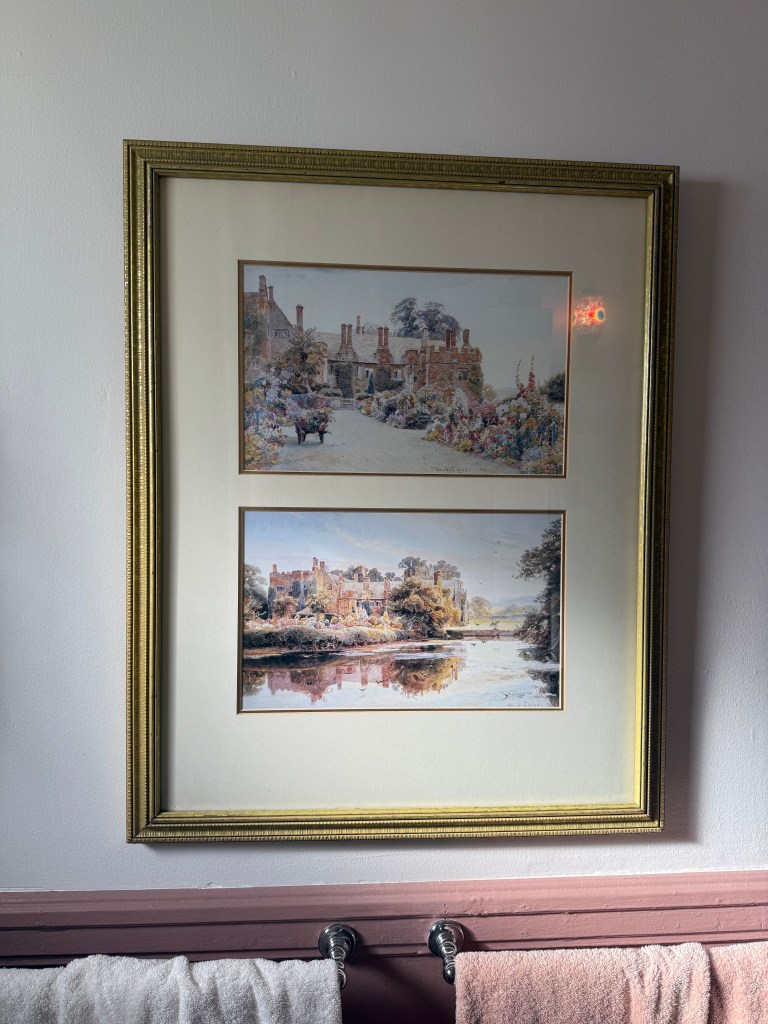 On the left are two prints (I couldn’t have a real painting in the bathroom!) by George Samuel Elgood that I got at Canal Street Antiques for $75. It’s kind of wild that I hadn’t heard of him until I purchased this; he was the leading garden painter in Britain! The middle painting I got at Brimfield Flea Market and is signed on the back “Susannah B. Howard 2008”. I believe she is a Philadelphia based artist. The right lithograph I found also at Canal Street Antiques for about $20 and is signed “Martha Williams.”