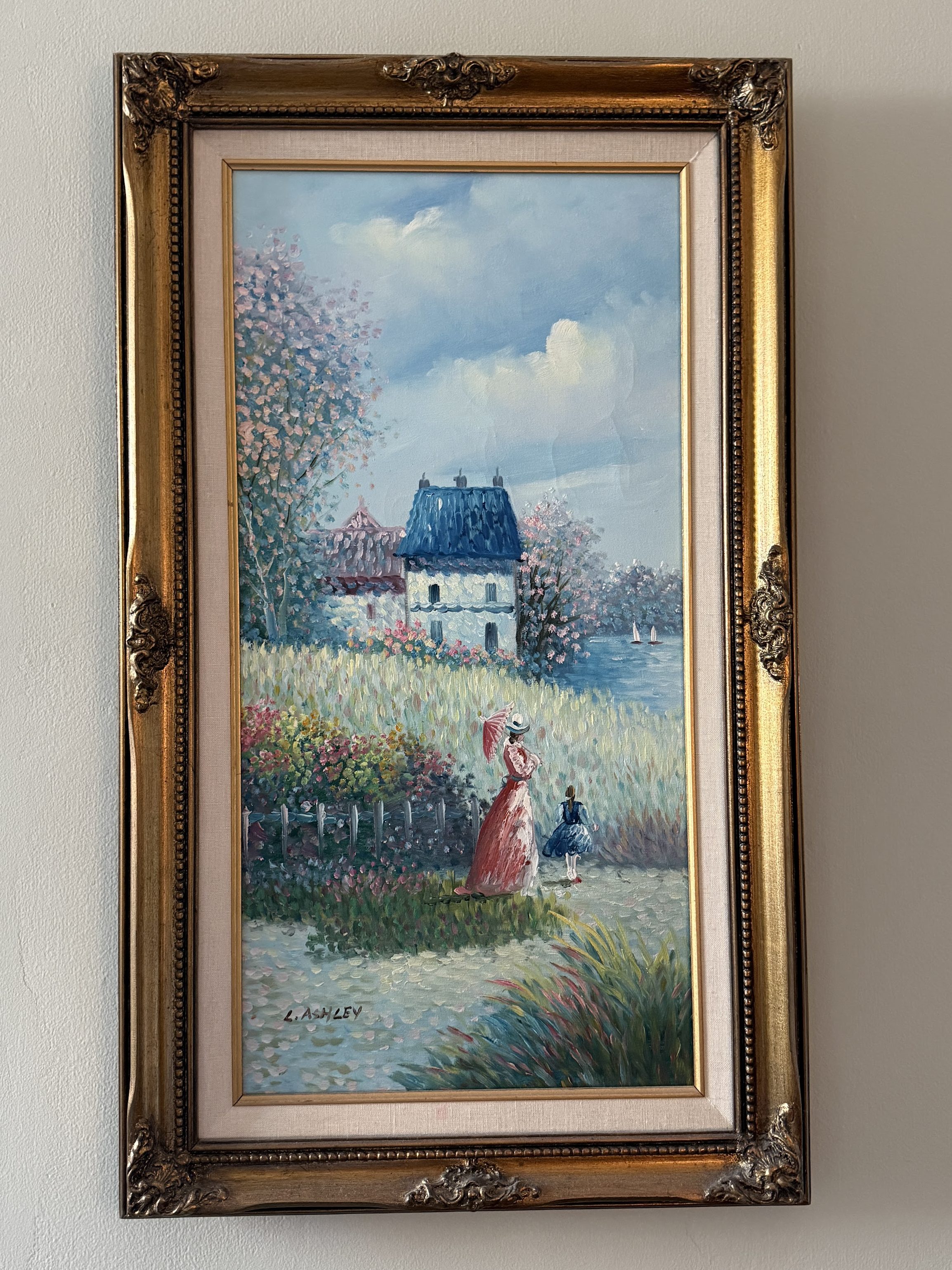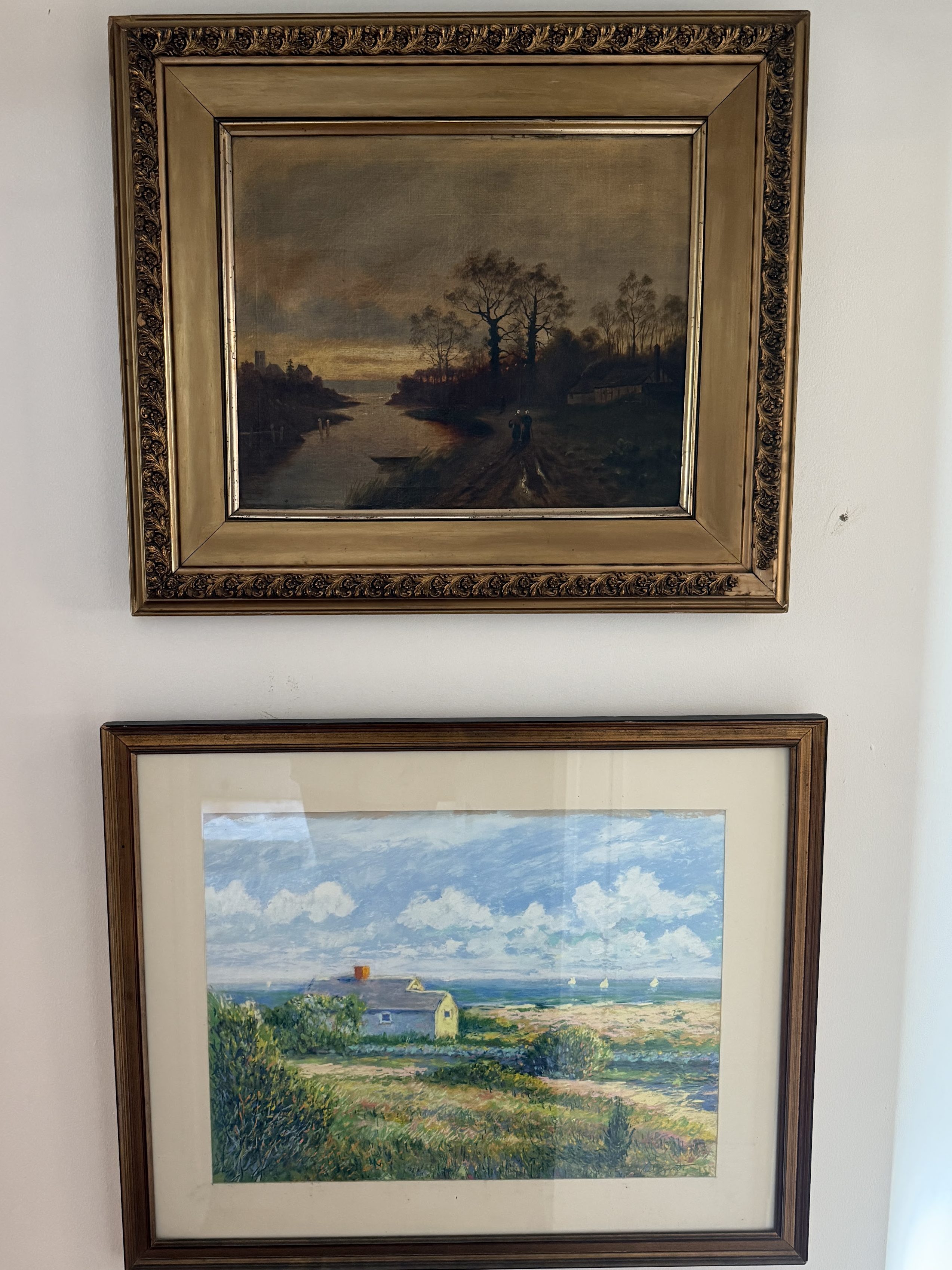 All three of these paintings I purchased at Brimfield Flea Market. The top left and right in 2023 for $200 and $100 respectively; the bottom left in 2025 for $100. These are 3 of my favorite paintings as well. The top left is an oil on canvas; I remember the dealer told me he got it an estate sale in New York where it had been hanging for generations. Unfortunately, I don’t know much else about it. If you look closely, you can see two people walking together at sunset and I always say that this painting is what my life will look like when I am 80. The bottom left is a coastal pastel signed “Vail Barrett” from Roxbury. When I saw the right painting at Brimfield, it was on the ground in a corner, the frame was barely hanging on, and it looked like it was struggling. When I tell you, my jaw dropped when I saw this painting…it’s an all time favorite; I love this type of late academic style work. It is signed “H. Marshall Jones” and I believe it is a late 19th century painting so it is OLD. Unfortunately, I can’t find much on this painter. The only contender is a Marshall Jones living in Boston and painting during summers in Nantucket during the last quarter of the 19th century, but his art doesn’t seem too similar to this.